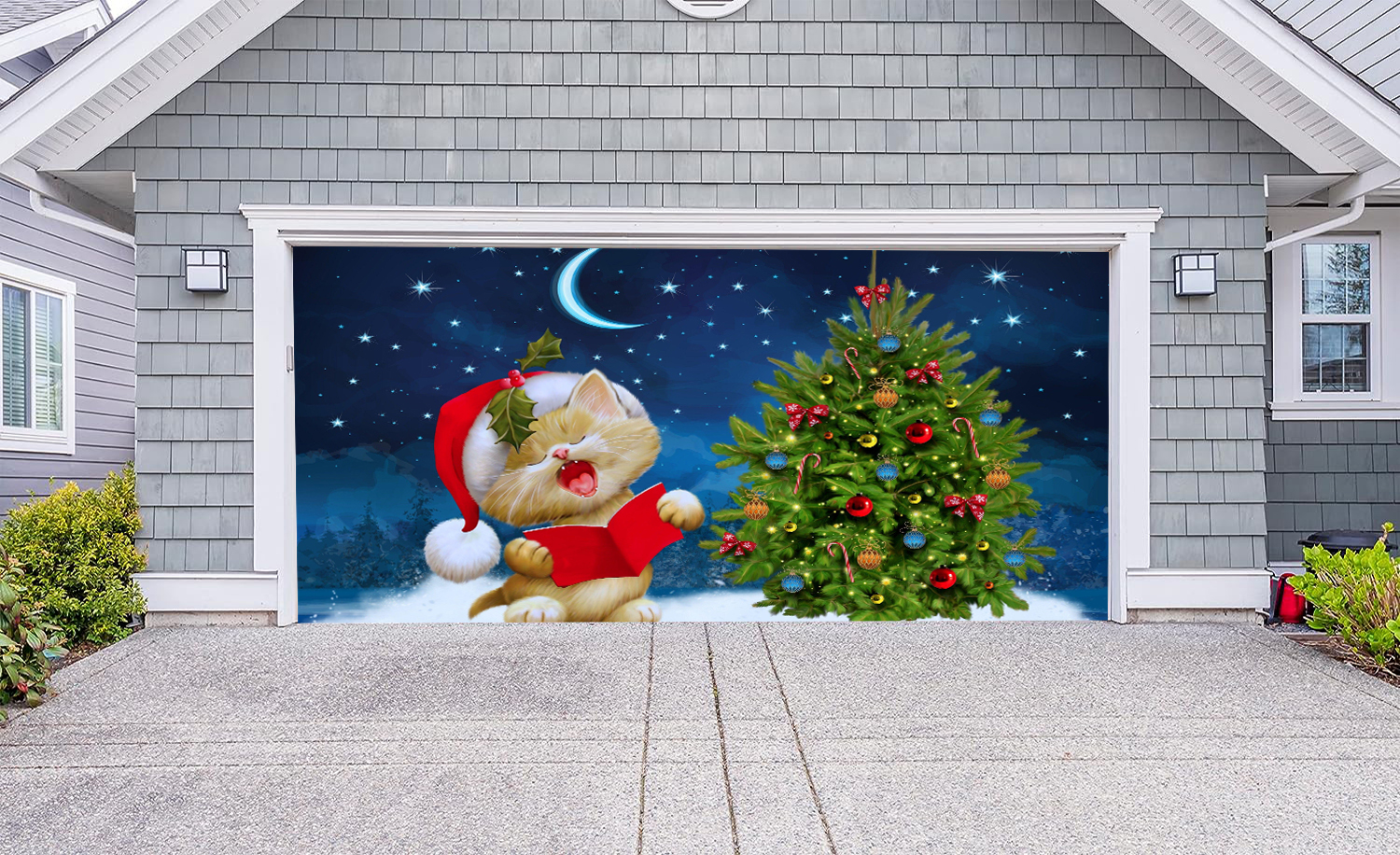Cute Cat And Christmas Tree Garage Door Mural