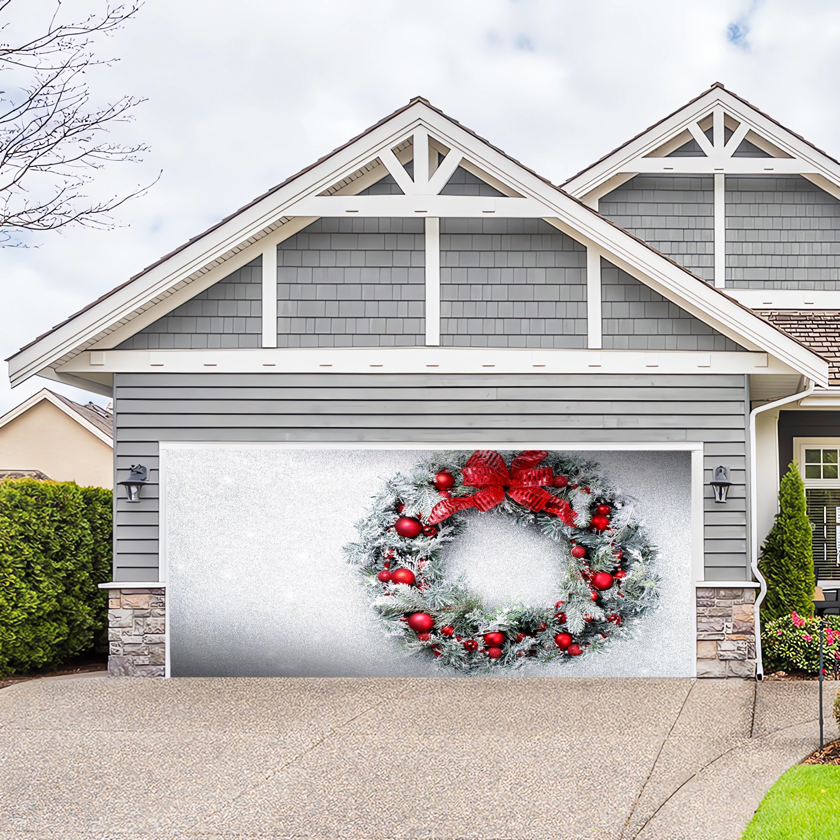 Looks like real ! Made out of top quality material and high resolution dye-sublimation printing. Festivemural selling unique garage door covers for the all year and seasons its made of high quality 100% polyester weather resistant and can be used for sectional panels and one piece tilt-up garage doors, if you’re garage door have dent , rusty or you just like to change the front of Your front house this is the great solution for your home.