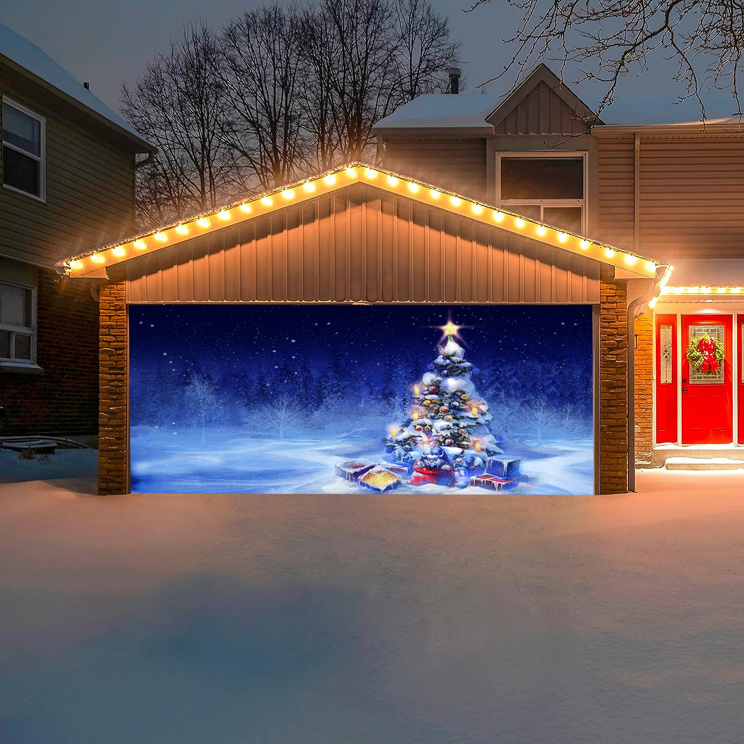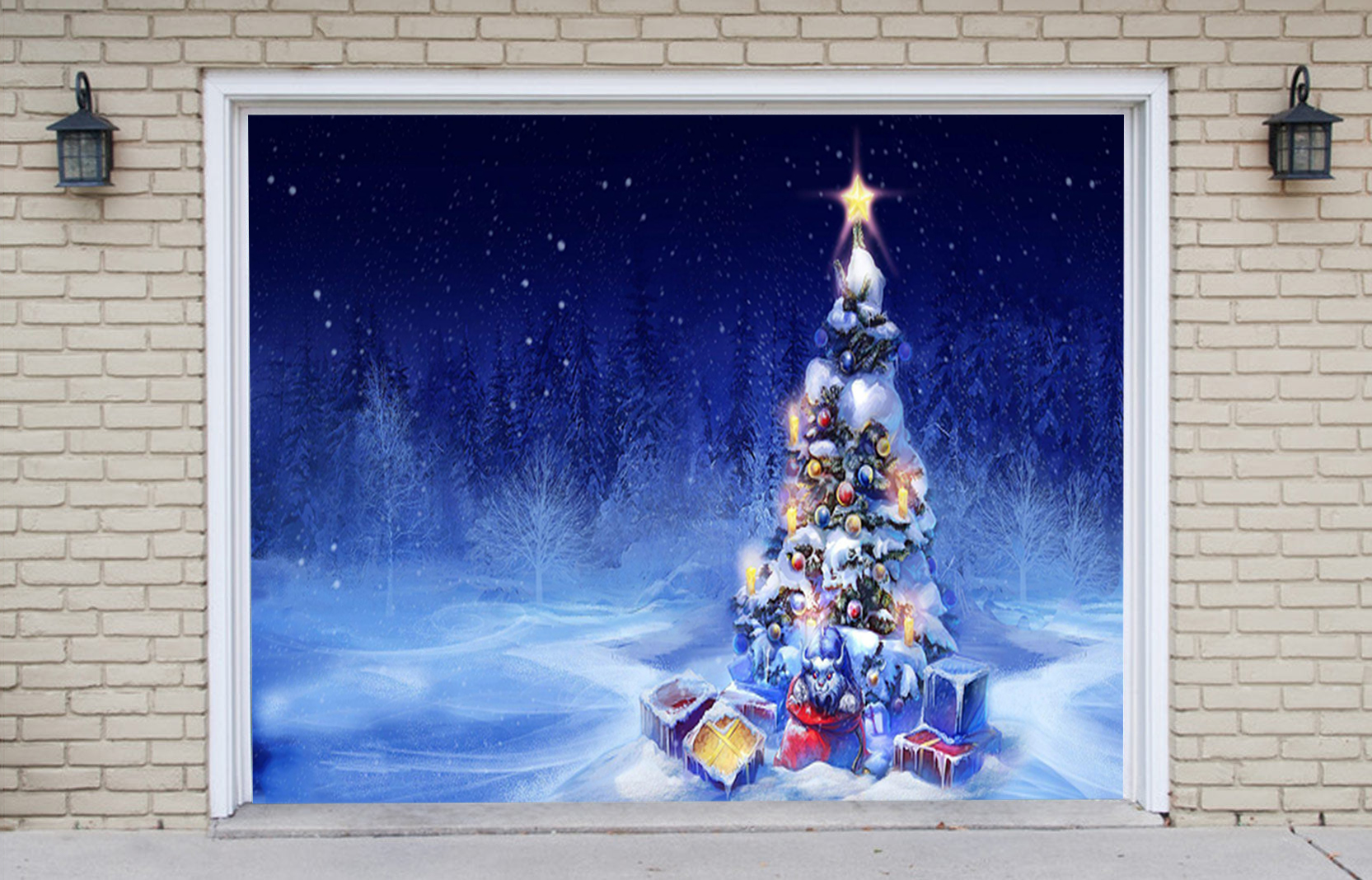 Looks like real ! Made out of top quality material and high resolution dye-sublimation printing. Festivemural selling unique garage door covers for the all year and seasons its made of high quality 100% polyester weather resistant and can be used for sectional panels and one piece tilt-up garage doors, if you’re garage door have dent , rusty or you just like to change the front of Your front house this is the great solution for your home.