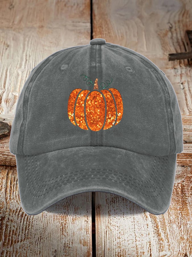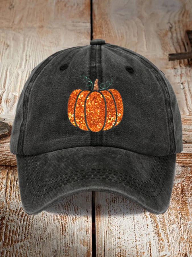 Unisex Washed Sequin Fall Pumpkin Print Hat